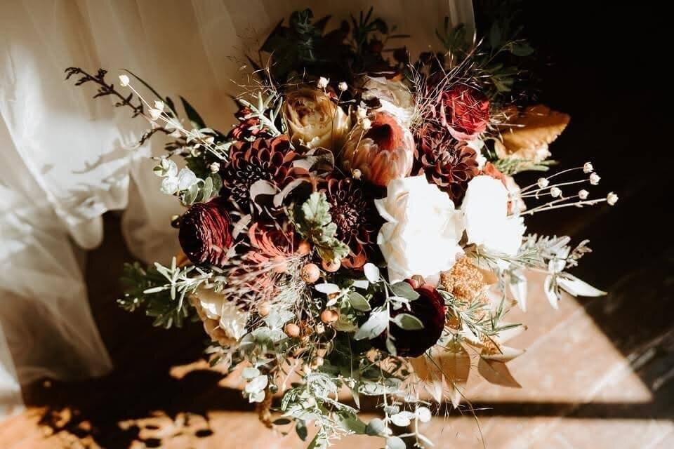Camp Lane provided the perfect venue for Amelia & Kyle’s bohemian style wedding with its natural, outdoorsy setting. Pampas grass graced the aisles and added flair to the triangle ceremony arch while the rich colors and textures of the flowers matched the aisle rugs and contributed to the down to earth vibe. A matching flower crown for the bride’s daughter coordinated perfectly with the luscious bridal party bouquets and boutonnieres. And a mix of amber glass and lace made the perfect table setting to show off the greenery, dried and fresh fall flowers that graced the tables.